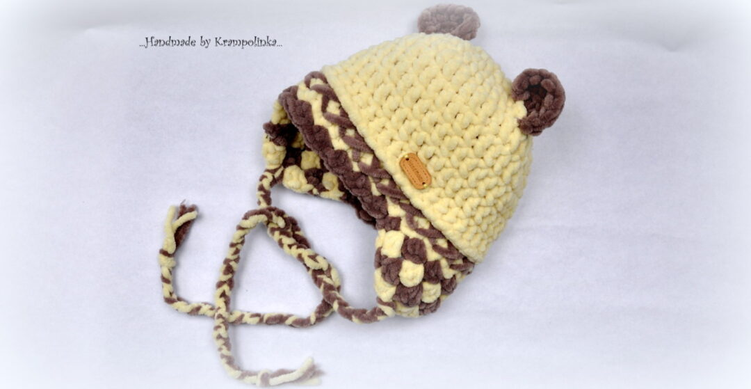 Na čepičce najdeme místo, kam naháčkujeme ouška. Na této čepičce naháčkováno do třetí řady. Začneme PO do vybraného DS. Dále háčkujeme 5 PDS do vedlejšího DS a končíme PO, ale o řadu níže, jakoby o jeden DS dopředu (ouško se hezky ohne do tvaru, mrkněte na detail fotky). Otočíme a do každého PDS naháčkujeme 2 PDS (10 PDS). Končíme PO do prvního PO. Volné konce protáhneme dovnitř čepičky. Opakujeme na druhé straně.