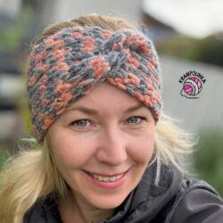 - Co se týče čelenky, budeme háčkovat od základního řetízku po řadách tam a zpět. Je důležité trefit správnou délku základního řetízku. Počet oček řetízku v návodu mám spočítáno na vlastní utahování. Tato čelenka sedí od velikosti 51 – 56 cm. Křížení čelenky vytvoříme po uháčkování pruhu tak, že krátké konce přeložíme na sebe a poté vložíme do sebe dle videa. Sešijeme v rubové straně a čelenku převrátíme na lícovou stranu.