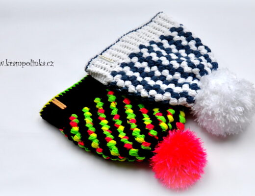 - Co se týče čepice, tento střih je jednoduchý, ale vyžaduje označovače a počítání. Uháčkujeme si základní řetízek. Pro dětskou čepici cca 25 cm pro dospěláckou čepici cca 30 cm. Háčkujeme obdélník po řadách tam a zpět. Mírně pokročilejší mohou pět ok na jedné straně háčkovat jako rozšířená pevná oka. Začátečníci háčkují vzor podle návodu vždy od začátku do konce řady. Háčkujeme tak velký obdélník, abychom ho obepnuly kolem hlavy. Jakmmile docílíme správné velikosti, protilehlé strany obdélníku sháčkujeme, otvor (tam, kde jsou případně pevná oka) stáhneme nebo sešijeme jehlou a nití. A tady se rozhodeme, jakou čepici chceme, zda-li s bambulí, pak na vrchol našijeme bambuli 18-20 cm, třeba od Bambulky výhodně. To pak můžeme nosit kulich s ohrnutím lemu nebo jako přepadlou čepici s bambulí. Nebo bambuli nenašijeme a čepici nosíme jako homelesku nebo s ohrnutím jako čepici. Pokud budeme nosit homelesku, doporučuji poslední řadu obháčkovat krátkým sloupkem rybí kost, jak je uvedeno třeba v tomto video návodu.