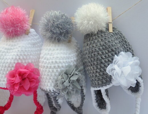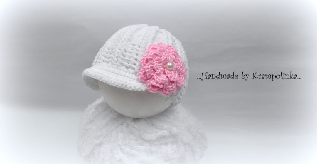 3. řada: do každého čtverečku uháčkujeme lísteček: 1 KS, 2 PDS, DS, 2 PDS, 1 KS. Vznikne nám takový kroucený pásek, který smotáme do tvaru kytičky. Přízi ustřihneme cca 30 cm od kytičky, navlečeme do jehly s velkým ouškem a v rubu kytičku prošijeme. Nakonec přiděláme knoflíček nebo perličku. Celou aplikaci našijeme na čepičku. POZOR pokud by byla kytička na čepičku přišita jenom skrz prostředek, bude při nasazení nepěkně odstávat, proto lepší přišít po celém obvodu a sem tam přichytit i okvětní lísteček.