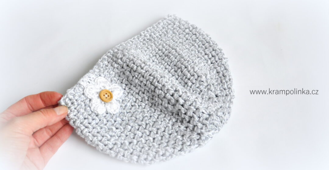 Čepičku jsem dozdobila jednoduchou kytičkou a krajkovým páskem. Přeci je jen určena pro čtyřletou holčičku. Decentní a přitom jemné a krásné. Pro zvětšení nebo zmenšení budete muset vyzkoušet přidat sloupky dle vlastního utahování. Reliéfní sloupky jsou v tomto krapet zrádné. No a my se do přechodovky na chladná rána pustíme.