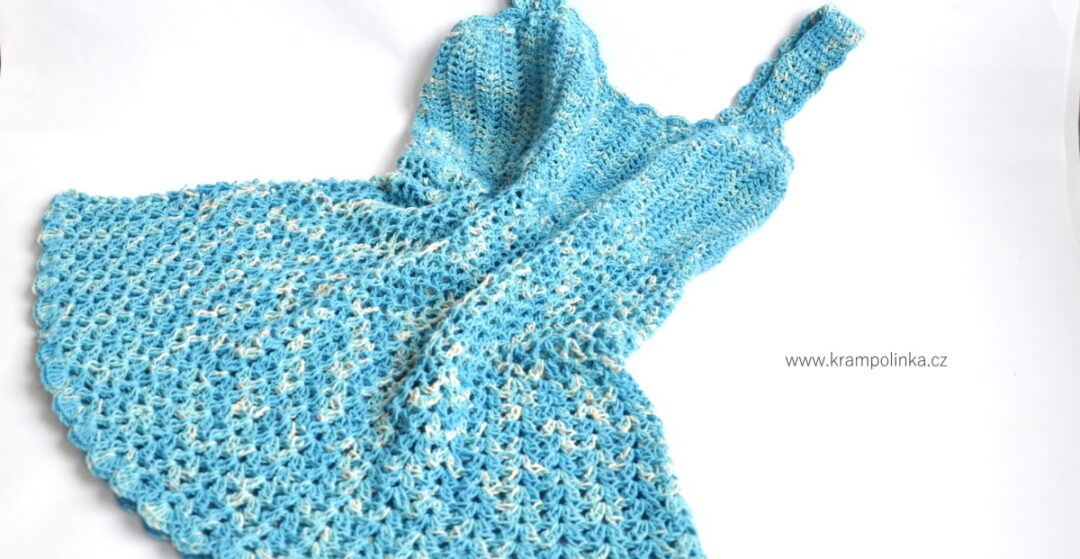 Spodní lem šatovky tvoří obloučky. Jakmile máme hotovou šatovku, obháčkujeme horní část živůtku – vytvoříme sámky. Následují ramínka a olem horní části živůtku kontrastní barvou.