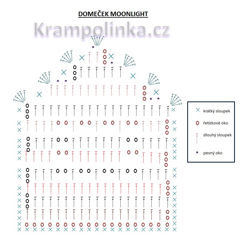 1. řada: ŘO a KS do jednoho očka. Do prostředního DS háčkujeme vějířek a KS do posledního DS. Dále háčkujeme vějířek do „hrany“ střechy (3x) a KS za DS řady. Na rovné straně háčkujeme 2 KS na jednu vodorovnou řadu. V rohu domečku háčkujeme 3 KS. Na spodní části domečku háčkujeme KS do ŘO. Druhou část lemujeme zrcadlově. Řadu končíme PO.