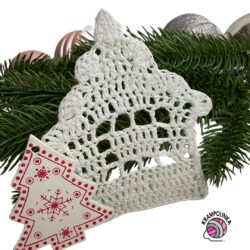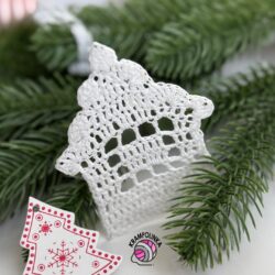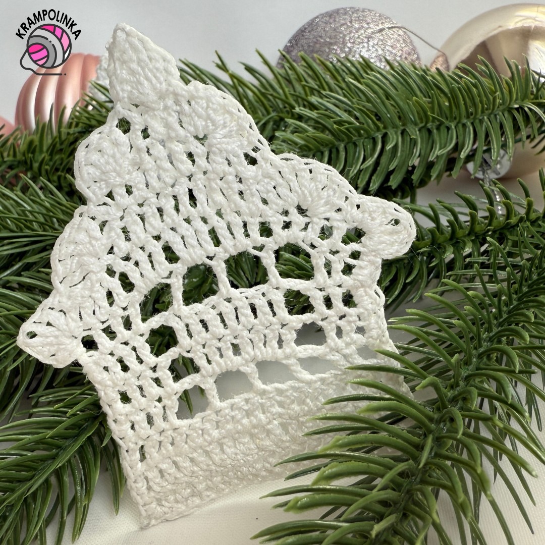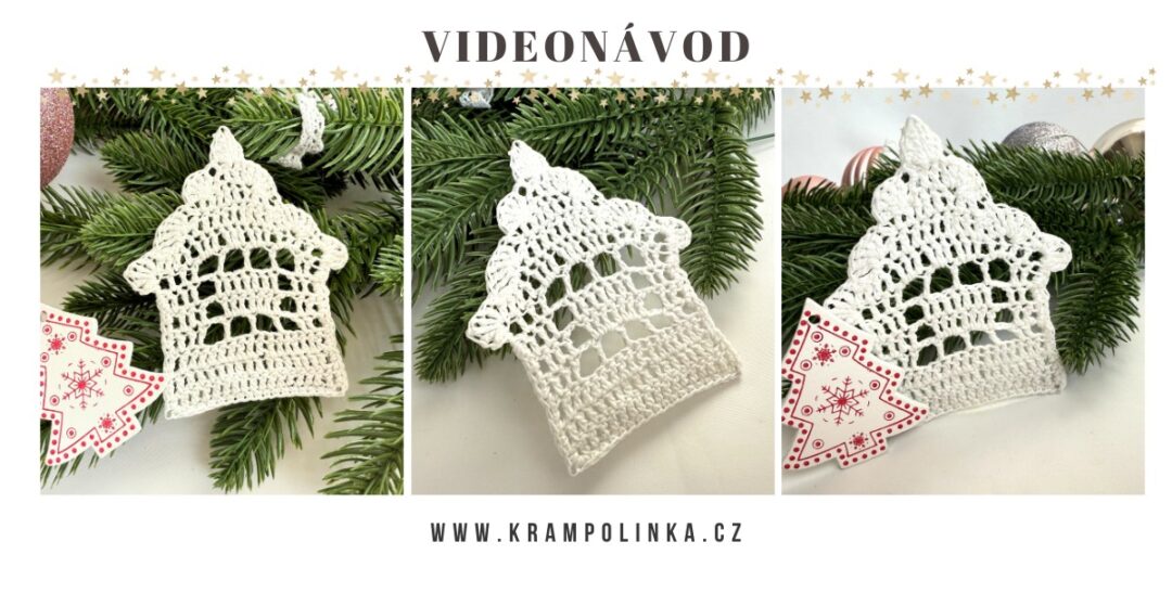 - Co se týče domečku, budeme háčkovat od základního řetízku po řadách tam a zpět. V posledním kroku domeček obháčkujeme. Zdobíme mašličkou či malými knoflíčky s vánočními motivy.