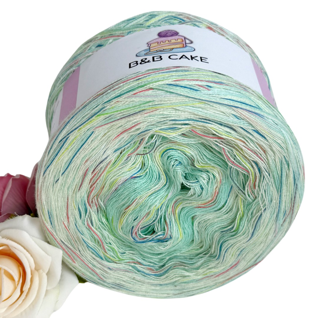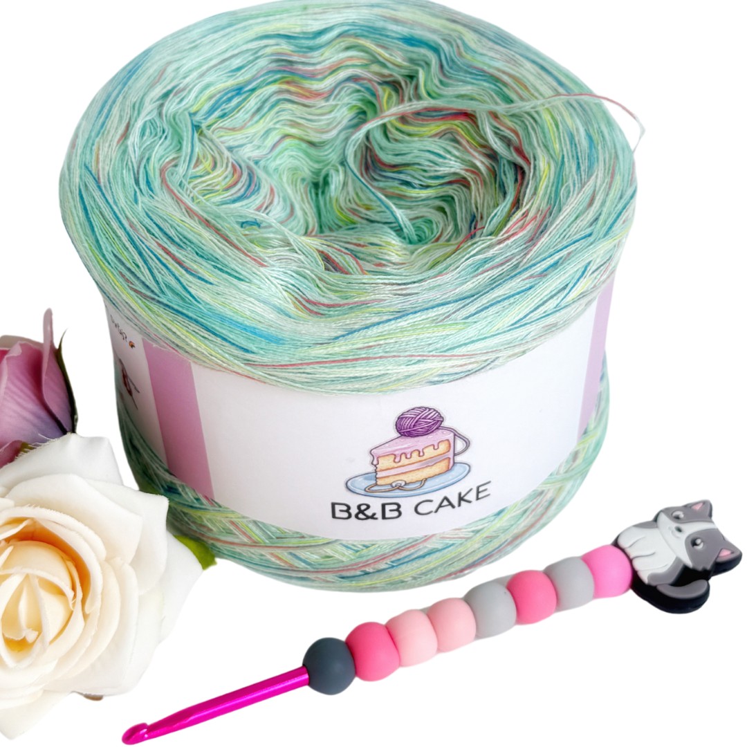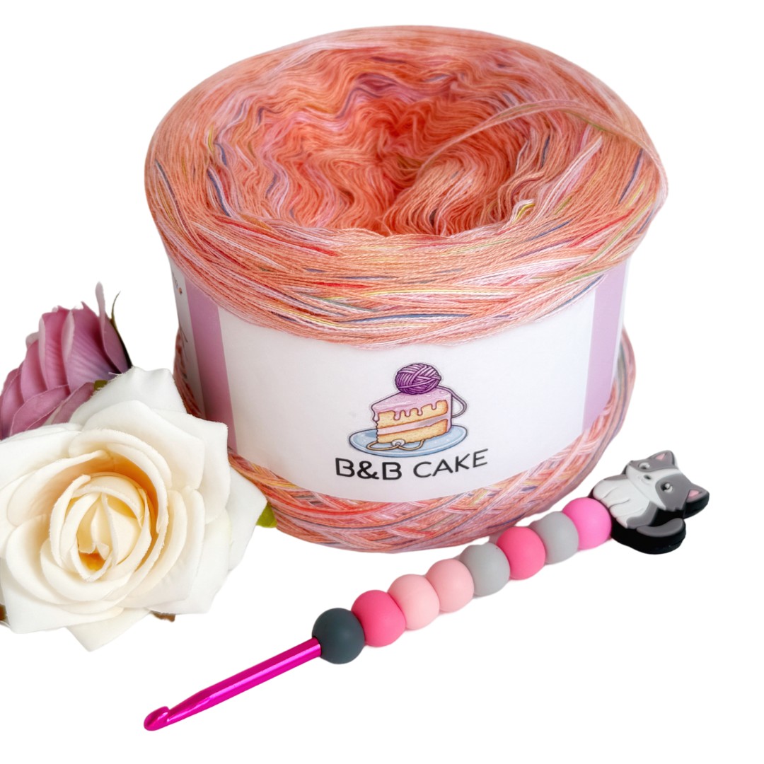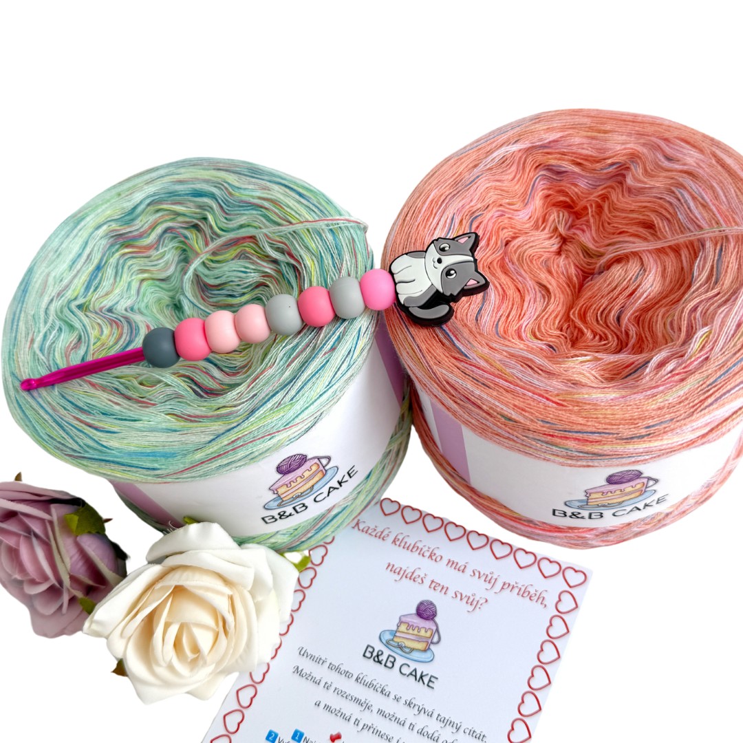 V balíčku na nás čekaly dvě duhovky BB CAKE s návinem 750 metrů. Délku návinu si můžete upravit při objednávce podle svých potřeb. Duhová klubíčka jsou složena z 50 % bavlny a 50 % akrylu a doplněna veselou přechodovou nitkou. Neobvyklé složení z pěti nitek slibuje hladké a rychlé háčkování, které vás bude bavit a nezabere věčnost.