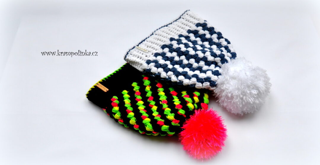 Na čepici jsem zvolila tzv. pružný lem, což je střídání předního a zadního reliéfního sloupku. Na lem navazuje bublinkový vzorek, známý také jako pecičkový nebo popcorn. Vzorek je hutný – na jednom místě je poměrně dost příze, a proto je čepule vhodná i na mírnou zimu, nebo chladný podzim případně jaro. S podšitím zvládne i krutomráz. Díky střídání barev ale moc nepruží. Proto je vzorek háčkovaný o číslo a půl větším háčkem. Na homelesku bych musela vzít háček ještě větší.