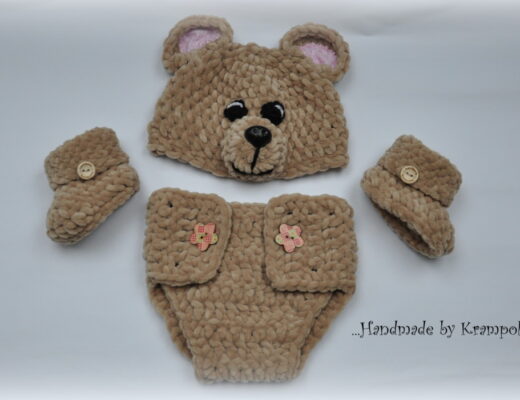 I designed this set almost year ago, at the beginnig of my Krampolinka crochet “career” and I shared this free pattern with you on my FB page. Since this website is growing a little…