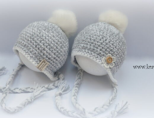 18. řada: lem u oušek obháčkujeme PDS, zátylek obháčkujeme KS, přední část čepičky obháčkujeme PR KS, v rozích (tam kde povedou šňůrky) háčkujeme 3 PDS, přízi ukončíme