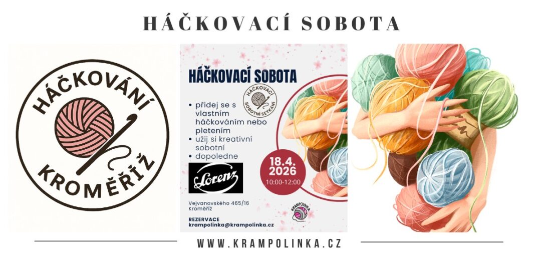Háčkovací sobota proběhne v sobotu 18. dubna 2026 od 10:00 do 12:00 hodin (nebo déle podle nálady) v kavárně LORENZCafé v Kroměříži (Vejvanovského 465, vstup od Podzámecké zahrady, parkování přímo u vchodu). Doporučuji rezervaci místa na e-mailu krampolinka@krampolinka.cz. Háčkovací soboty jsou pravidelná setkání v Kroměříži, která se konají jednou měsíčně.
