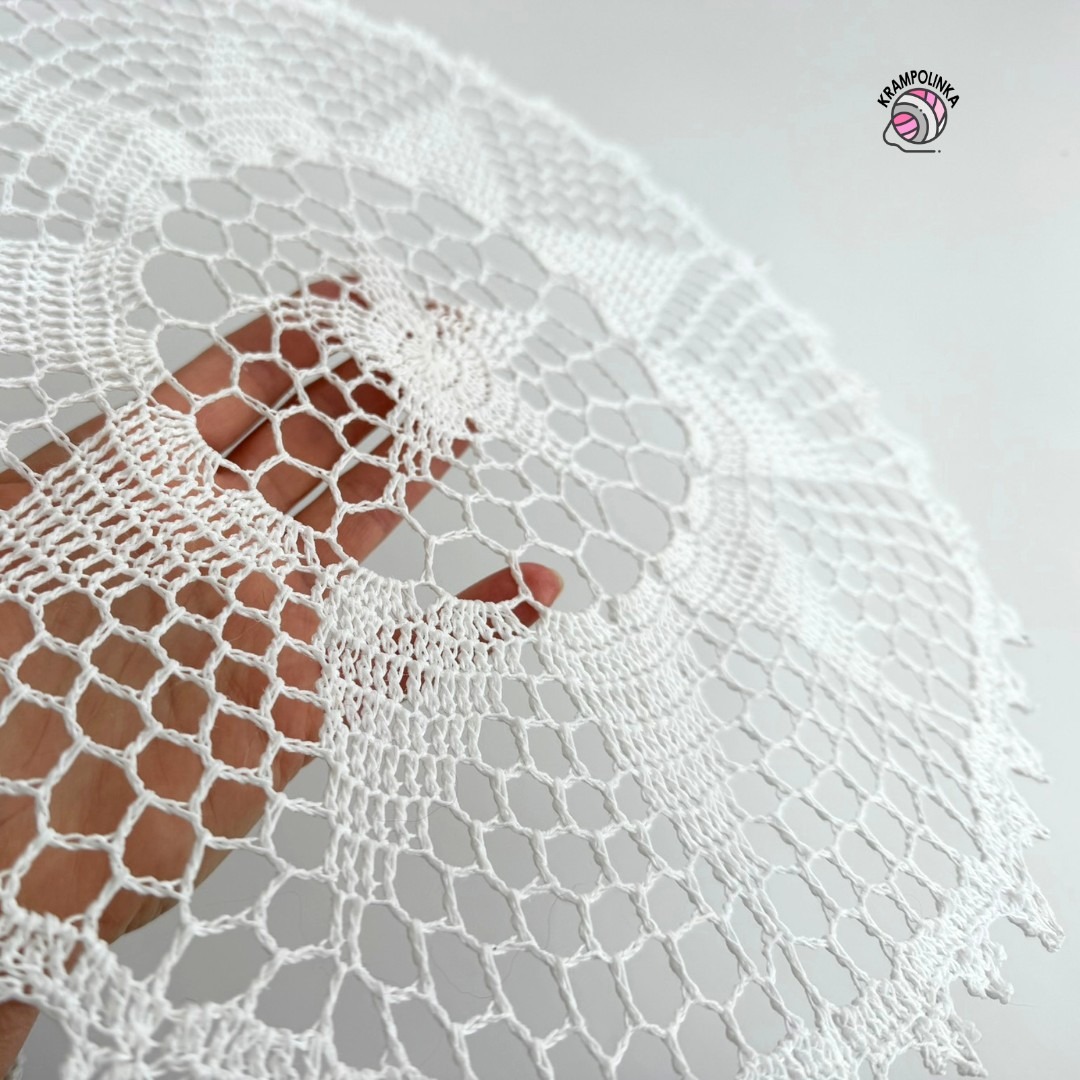 Na háčkování jsem zvolila přízi Puppets Eldorado síly 12 (100 g / 570 m), což je 100% mercerovaná bavlna. Příze je jemná, krásně drží tvar a výborně se z ní pracuje. Skvěle se hodí na dečky, ubrusy, dekorace, zvonečky i lehké letní oblečení. Použila jsem háček 2 mm zn. Tulip. Přízi můžete zakoupit například u Bavlnkarna.cz nebo Bavlnkaren.sk. Doporučuji použít přízi o stejném návinu. Klubíčko Puppets jsme si také podrobně ukázali v podcastu Povídání u klubíčka #119 a článek si můžete přečíst zde.