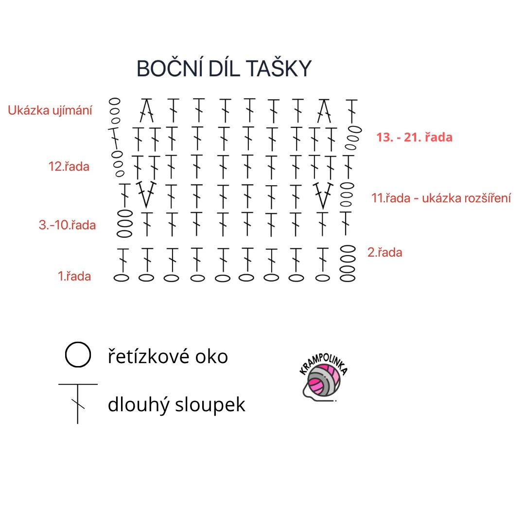 1. řada: Boční část spojíme pomocí pevného oka s prvním panelem tašky. Háčkujeme po lícové straně, přičemž nabíráme zadní nitku DS panelu tašky a přední nitku krátkého sloupku bočního pruhu. Háčkujeme KSRK. Vznikne vystouplý ozdobný lem.