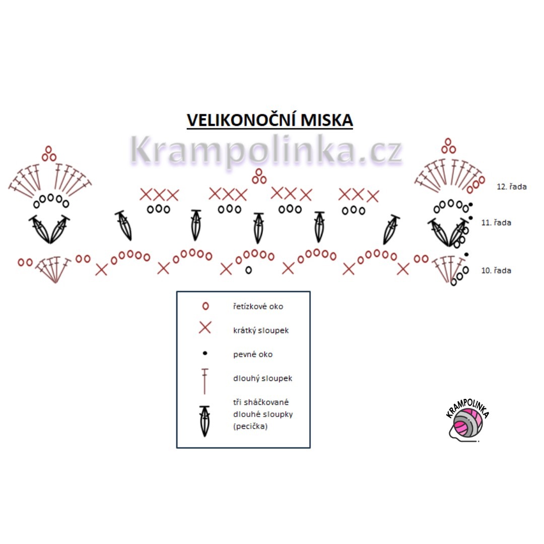 10. řada: 3 ŘO místo DS, 4 DS pod oblouček, 2 ŘO a KS mezi dvě pecičky, 5 ŘO (5x), KS mezi dvě pecičky, 2 ŘO a 5 DS pod oblouček. Vzor opakujeme. Řadu končíme 2 ŘO a PO.