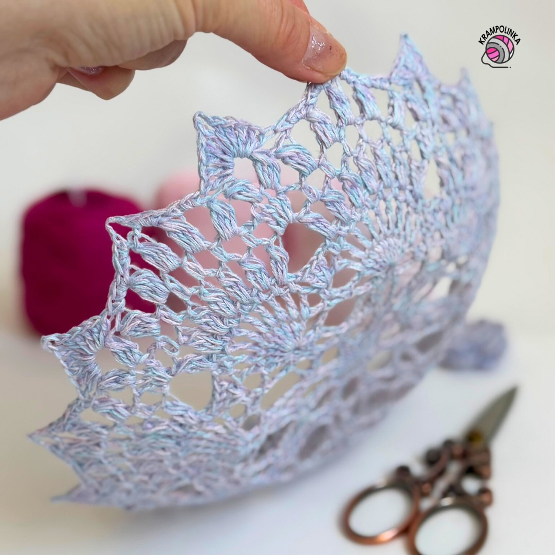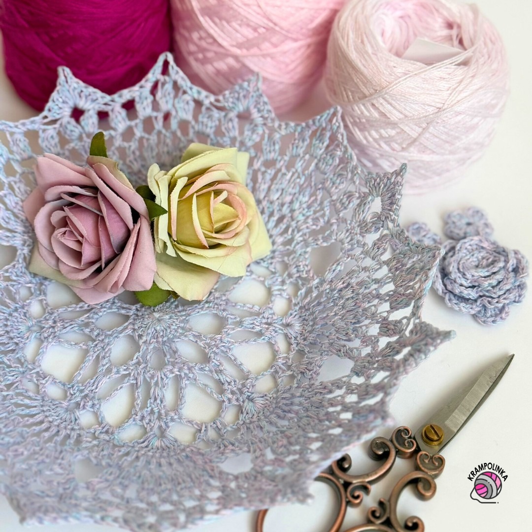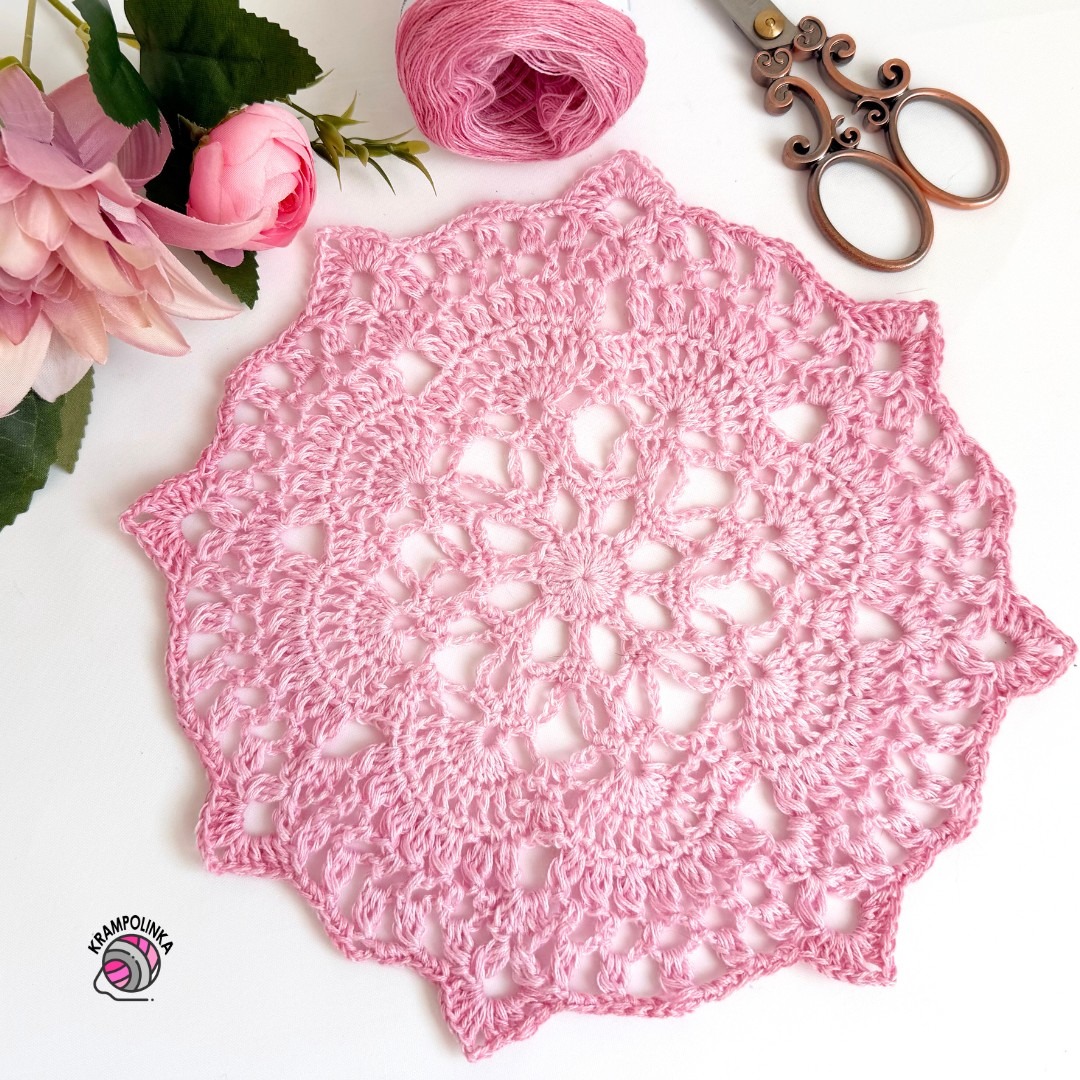 Na háčkování mandaly jsem použila háček Tulip velikosti 2,5 mm. Pokud háčkujete volněji, doporučuji zvolit háček 2 mm. Mandalu pro misku budeme háčkovat od magického kruhu stále v jednom směru. Jednotlivé řady ukončujeme pevným okem nebo vhodným sloupkem tak, abychom skončili přibližně v polovině obloučku. Základ mandaly vychází ze zahraniční knihy Motif and Doily, kterou jsem pořídila na Aliexpressu. Původní nákres jsem však upravila a rozšířila o několik řad, abychom dosáhli průměru přibližně 23–25 cm.