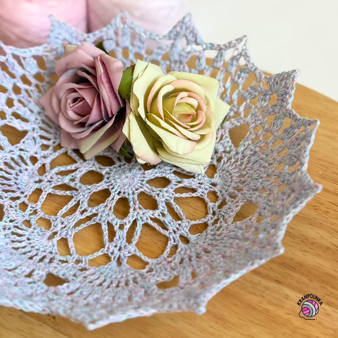 - Pokud nechceme misku, uháčkujeme klasický ubrousek – dečku na stůl