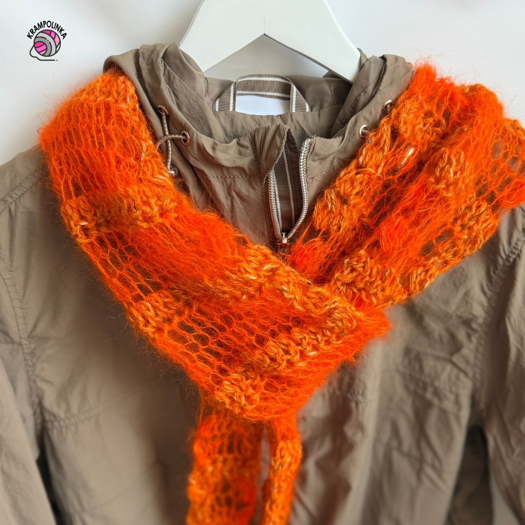 Na tento model stačí jedno klubíčko Rowan Kidsilk Haze a necelé klubíčko Rowan Felted Tweed. Vznikne tak naprosto unikátní, lehký a velmi trendy kousek, kterým snadno doladíte jakýkoliv outfit. Temně oranžovou barvu běžně nenosím, ale pořídila jsem si jarní parku v hnědavém odstínu a právě tato kombinace spolu krásně ladí. Příze značky Rowan pochází z Velké Británie a vyniká vysokou kvalitou. Rowan Felted Tweed má složení 50 % merino vlna, 25 % alpaka a 25 % viskóza, gramáž 50 g a návin přibližně 175 m (barva Marigold). Druhé použité klubíčko je Rowan Kidsilk Haze je luxusní směs 70 % mohéru a 30 % hedvábí, gramáž 25 g a návin přibližně 210 m (barva Tangerine).
