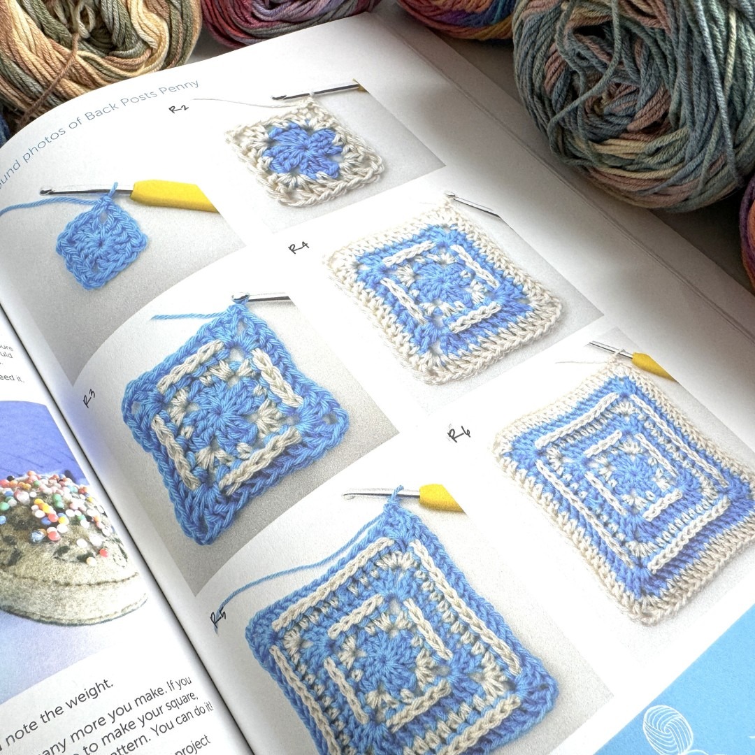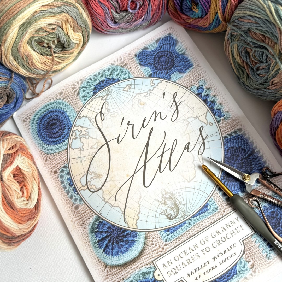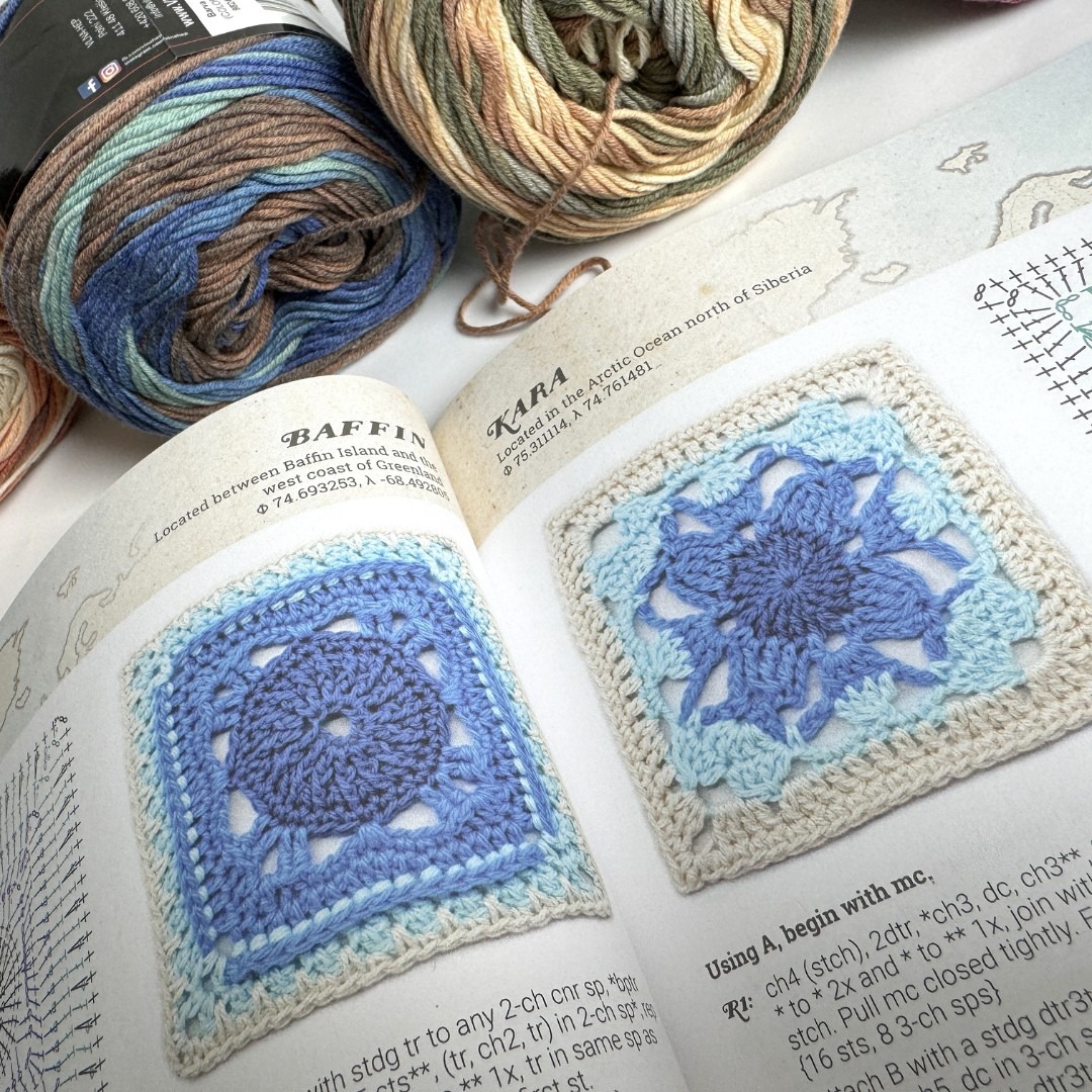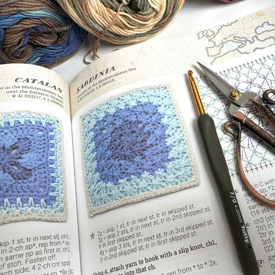 Naprosto skvělá kniha v anglickém jazyce je SIREN´s ATLAS – Oceán háčkovaných čtverců od Shelley Husband. Já mám variantu s návody na háčkování podle britské terminologie. Kniha obsahuje 64 návodů na čtverce v nádherných odstínech modrá – bílá – smetanová. Barvy si vyberete podle vlastních preferencí. Jednotlivé čtverce jsou pojmenovány po částech světa, takže při háčkování máte pocit, že vlastně háčkem cestujete. Každý návod má nákres, návod v ANGLIČTINĚ a fotku hotového čtverce. Pokud rozumíte nákresům, tak si s knihou poradíte. Kniha zatím nebyla přeložena do češtiny, ale věřím, že na ni dojde. Je totiž naprosto skvělá. Na Joom mrkněte sem.
