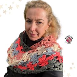 Délku a šířku kruhové šály volíme podle toho, jak dlouhý máme krk. Pro kratší krk háčkujeme spíše méně omotání nebo nákrčík háčkujeme užší.
