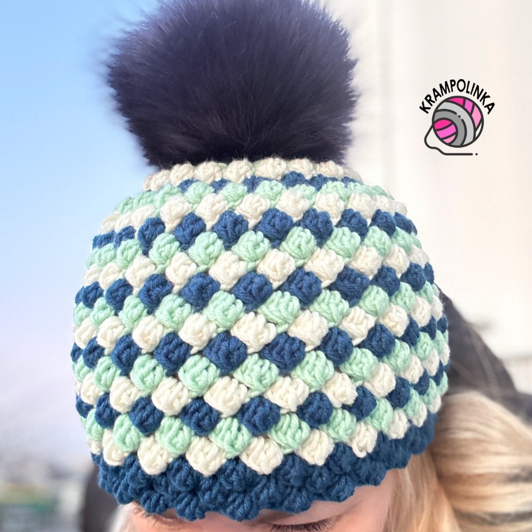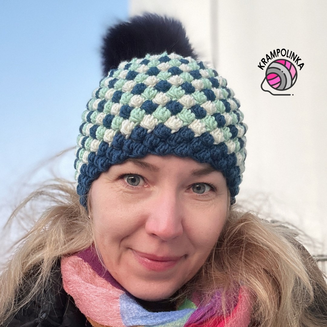 - Co se týče vzoru, konkrétně tento jsme ještě neměli, ale je podobný vzoru na kulichu Start. Budeme háčkovat čtyři sháčkované dlouhé sloupky, řetízkové oko a pevné oko, vše do jednoho očka. Prsty protlačíme bublinu na lícovou stranu. Ve vzoru se špatně přidává, proto jsou první řady prokládány dlouhými sloupky, díky kterým můžeme rozšiřovat. Střídání barev aplikujeme hned od počátku, takže změna ve vzoru není tolik viditelná.