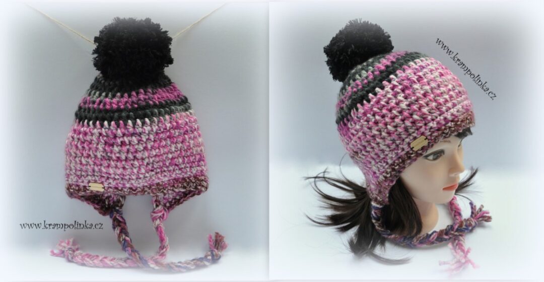 Ukončíme a zapošijeme volné konce. Šňůrky vytvoříme tak, že ustřihneme 6 stejně dlouhých provázků, přepůlíme, provlečeme rohem kulišanky (jakoby špička klapky u uší) a upleteme pletýnku. A můžeme se vrhnout na háčkovanou bambulku.