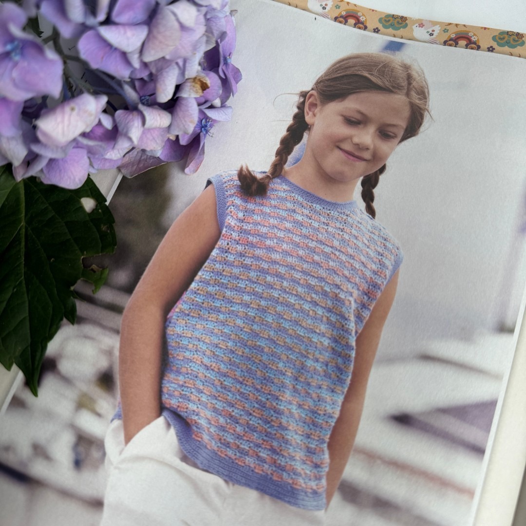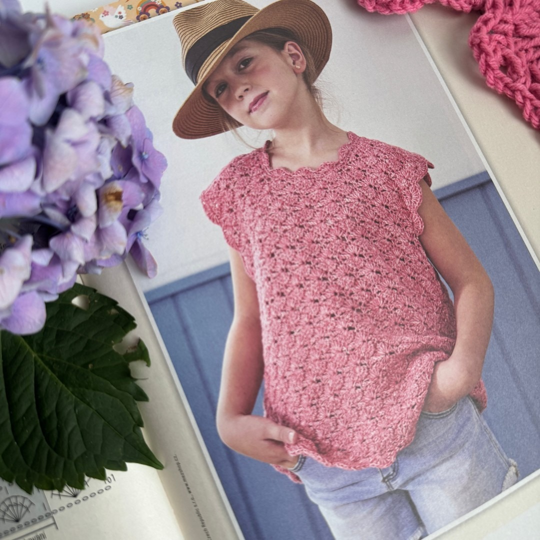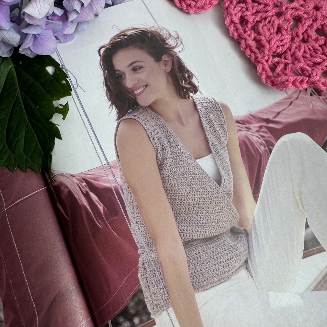 - háčkovaný klobouk z papírové příze, čtyři háčkované motivky, trendy háčkované tílko ze čtverců, háčkovaný dětšký topík a vestička, zavinovací vestička;