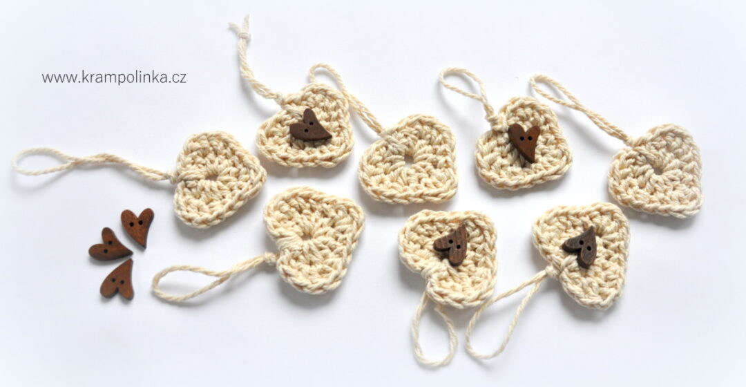 Volné konce buď zapošijeme nebo zasukujeme a ustřihneme. Srdíčko dozdobíme knoflíkem, nebo perličkou, případně mašličkou.