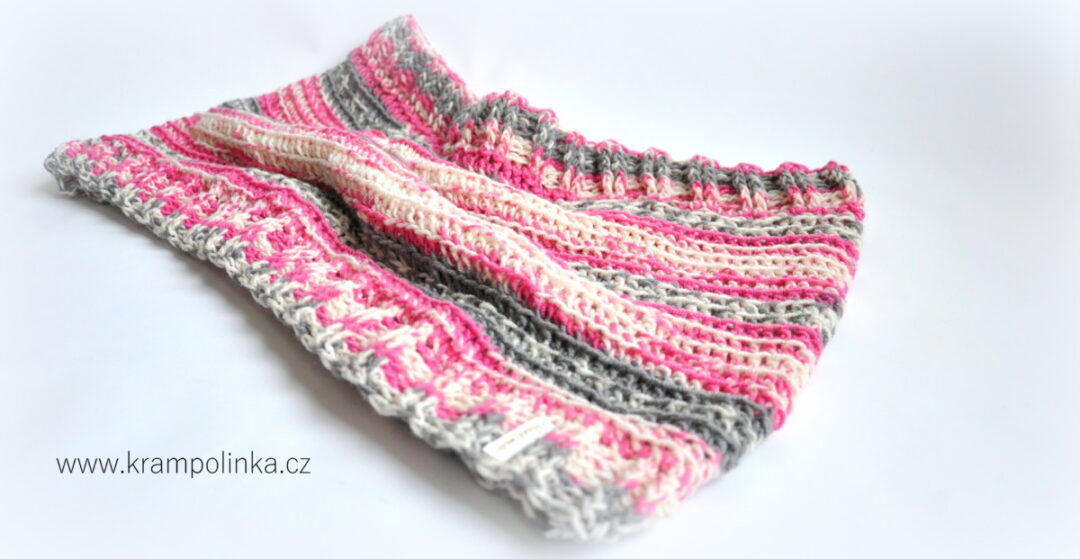 Co se týče vzoru, je to velmi jednoduché. Stejně jako u homelesky nebo svetříku háčkujeme PDS za zadní nitku. Hlavní část nákrčníku háčkujeme tzv. dokola bez ukončování řad, pružné lemy ukončujeme pevným okem a začínáme náhradou. Vzhledem k pružnému lemu je potřeba kalkulovat konečný počet ok dělitelný čtyřmi. Začínáme pružným řetízkem menším háčkem, dále vyměníme háček za větší. Pružné lemy háčkujeme větším háčkem, ať nákrčník lem moc nestáhne. Jedná se spíše o sjednocení do setu. No a my se do něho pustíme.
