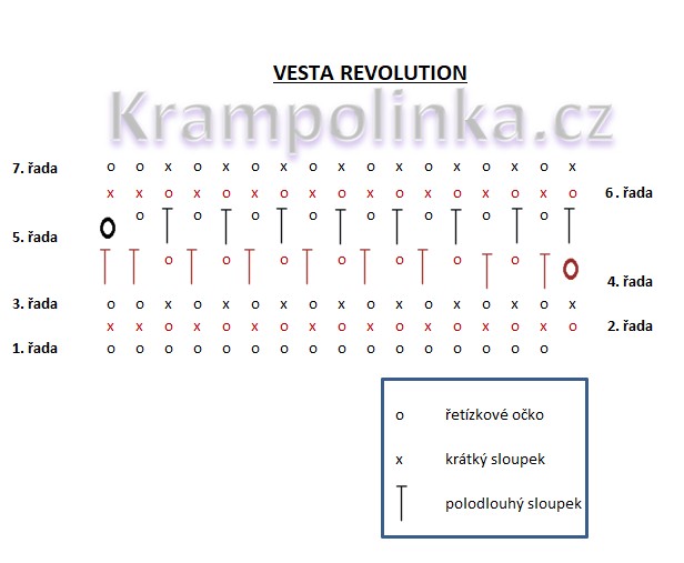 - Co se týče vzoru, potřebujeme pouze řetízková oka, krátké sloupky a polodlouhé sloupky.