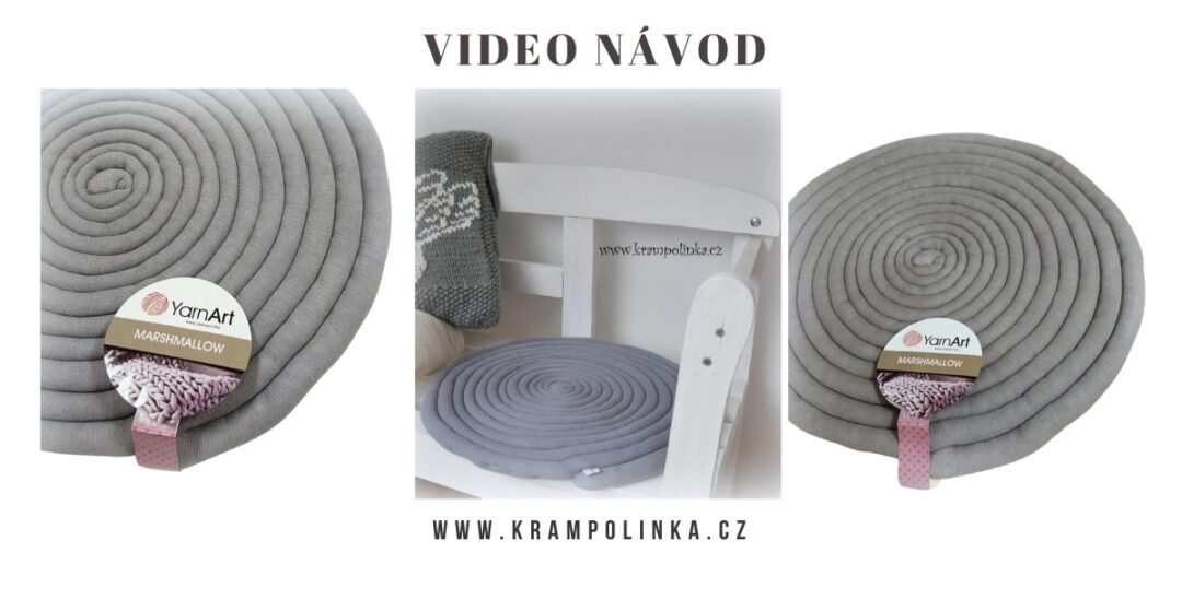 Ovšem tentokrát mě myšlenka opravdu nedonutila vstát. Tvoření jsem si nechala až na následující odpolední video natáčecí siestu. Vytvořit zamotaného “šneka” není velká věda, ale i tak jsem raději natočila video. Podsedák má průměr 43 cm, spotřeba je cca 7 metrů a vzhledem k tomu, že XXL příze YarnArt Marshmallow má třicet metrů v klubíčku (750g), můžete pohodlně udělat podsedáky čtyři.