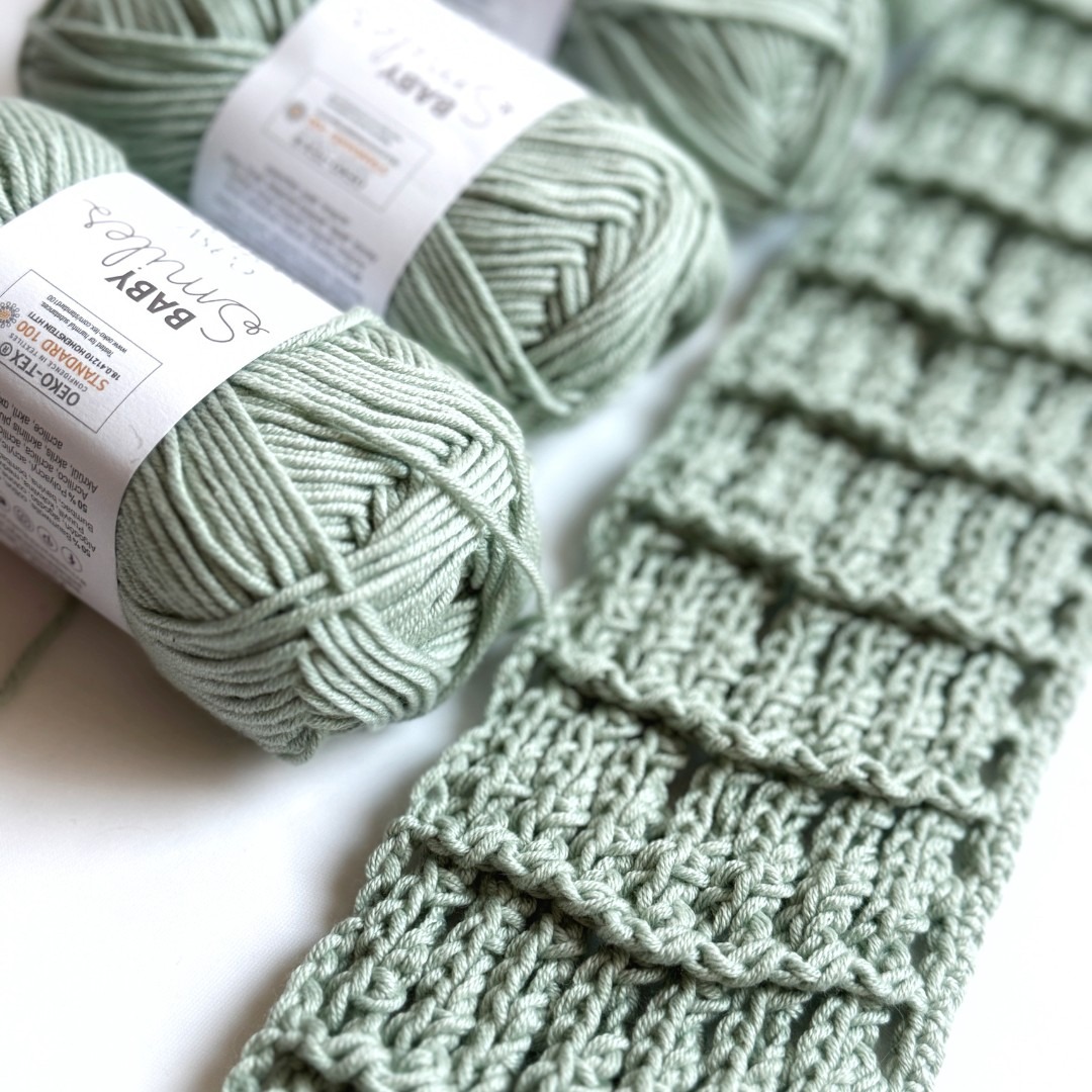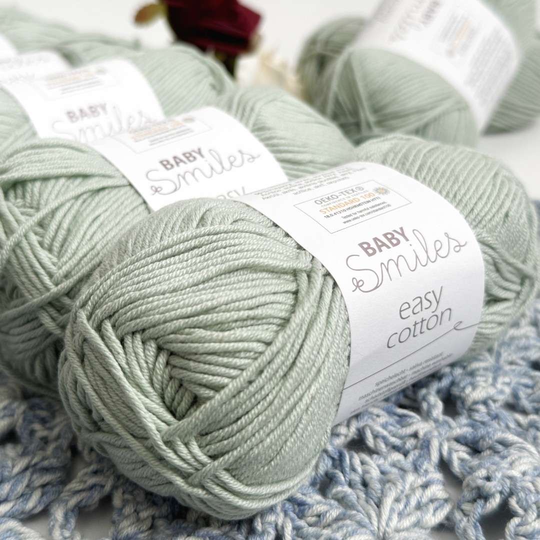 Schachenmayr Baby Smiles Easy Cotton, barva 1077 pistaciová. Klubíčko je typické podzimní či jarní a má 50g s návinem 120m. Jedná se o typickou podzimní a jarní směs 50% bavlna a 50% akryl. Příze je jemná, měkoučká a bude se hodit na podzimní, zimní až jarní svetříky, čepice, šály, tunely a šátky. Hned jsem materiál vyzkoušela a chystám pro Vás video návod na nový vzoreček. Easy Cotton má pěkný výběr v barvách zde a lze kombinovat i se Schachenmayr Easy Cotton Spritz, který jsme si představili zde.
