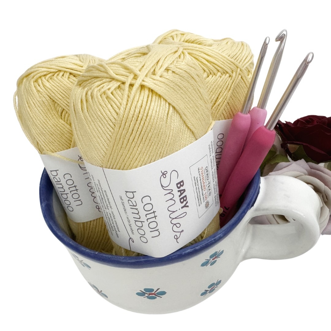 Schachenmayr Baby Smiles Cotton Bamboo, barva 1021 vanilková. Jedná se o velmi příjemný materiá, klubíčko má 50g a 156m. Je to směs 52% bavlna a 48% viskóza a příze se bude hodit na celoroční lehký svetřík, kardigan nebo šatovku. Cotton Bamboo má krásný výběr v barvách. Na svetřík velikost 42 se doporučuje cca 500g. Výrobek bude splývavý a mírně povolí. Více barev si můžete prohlédnout zde