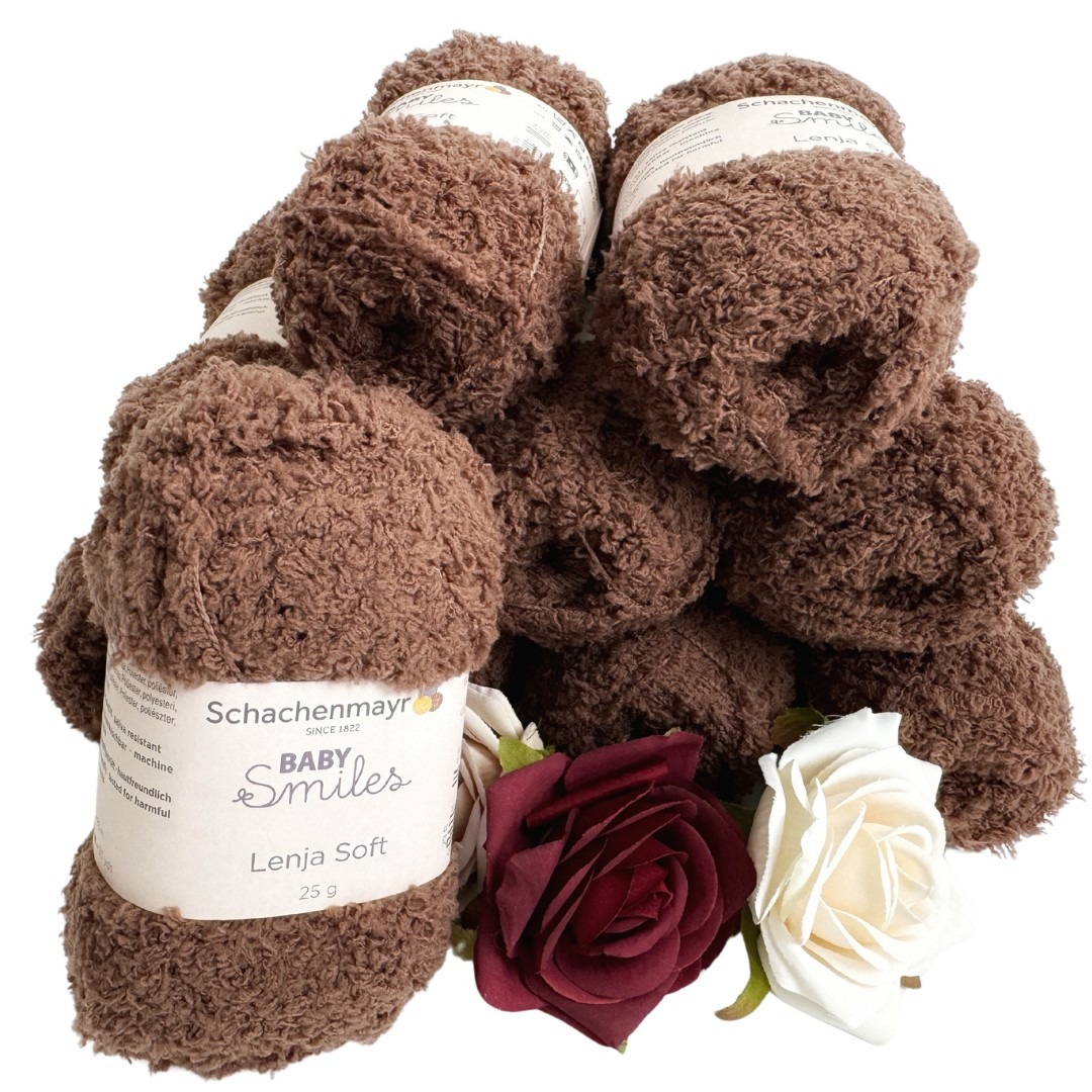 Schachenmayr Baby Smiles Lenja Soft, barva 1011 hnědá (teddy). Nadýchané a měkoučké klubíčko 25g s návinem 185m. Jedná se 100% polyester a příze bude super na háčkované hračky, medvídky, efektní čepice, deky, polštáře pro děti. Má atest pro děti do tří let, ale pokud máte doma miminko, které vše strká do úst, nechala bych tuto přízi napozději. Lenja Soft se vyrábí v efektních barvách a z podobné jsem tvořila čepičky a sety na tvoření, případně domácí bačkůrky a capáčky. Hodí se i na háčkované bambulky. Na barvy mrkněte sem.