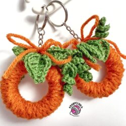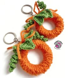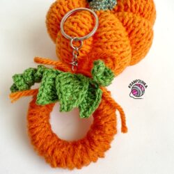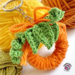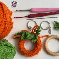• Co se týče přívěsku, budeme potřebovat dřevěný kroužek o průměru 4.5 cm, který omotáme háčkovaným řetízkem. Dozdobíme háčkovanými lístečky nebo lístečky z filcu. Doplníme o přívěskový komponent a dýni můžeme nosit na klíčích, kabelce či na baťůžku.