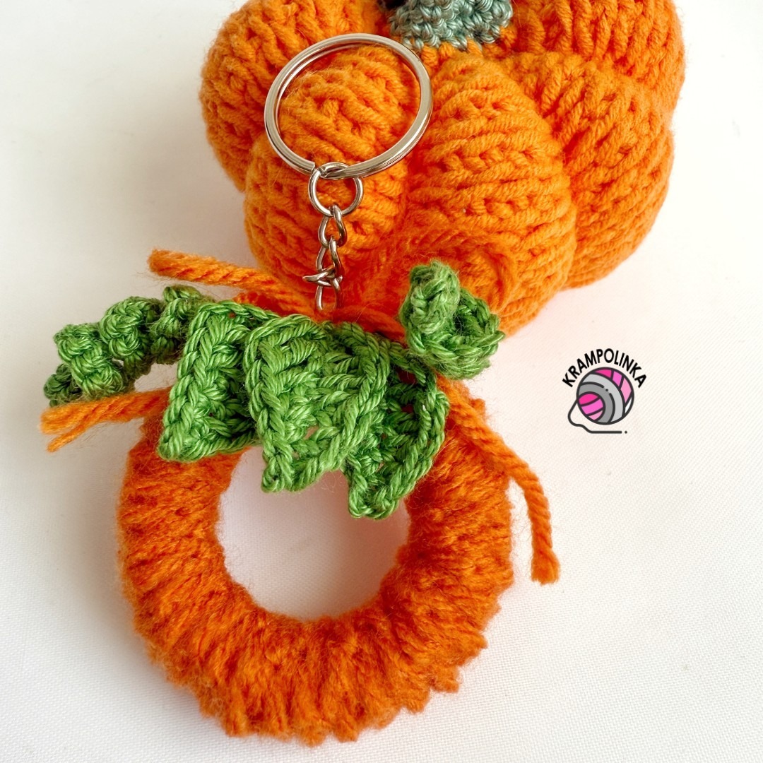 • Co se týče přívěsku, budeme potřebovat dřevěný kroužek o průměru 4.5 cm, který omotáme háčkovaným řetízkem. Dozdobíme háčkovanými lístečky nebo lístečky z filcu. Doplníme o přívěskový komponent a dýni můžeme nosit na klíčích, kabelce či na baťůžku.