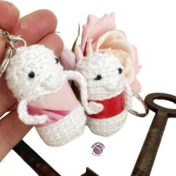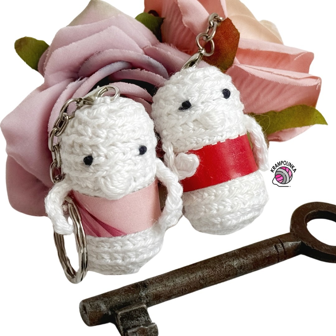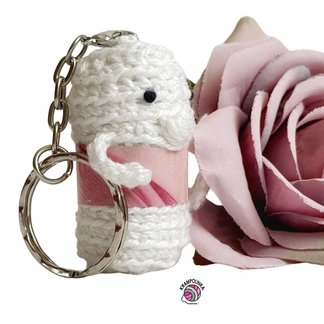 Na připevnění na klíče si pořídíme kroužek s řetízkem a karabinkou. Kroužek jednoduše připevníme při zapošívání spodního volného konce. Klubíčko ve středu stáhneme proužkem tvrdého papíru. Pokud na papír natiskneme jméno, můžeme jednoduše rozlišit komu které klíče patří.