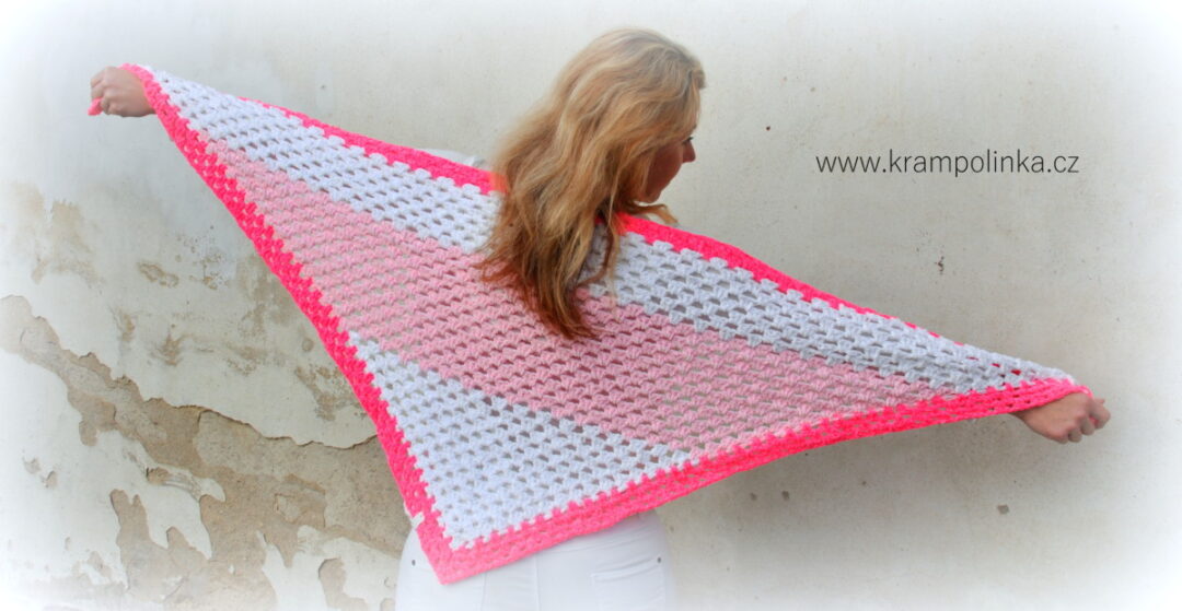 Šátek je naprosto jednoduchý. Používáme pouze dlouhé sloupky a řetízková oka. Začínáme od magického kroužku a háčkujeme po řadách tam a zpět. Pokud se Vám nedaří magický kroužek, nahraďte jej třemi ŘO spojených pevným okem. Na krajích používáme dvakrát nahazovaný dlouhý sloupek, který však háčkujeme na dvakrát stejně jako klasický dlouhý sloupek. Použila jsem ho kvůli tomu, aby se strana díky různému utahování nekrabatila (dvakrát nahazovaný sloupek byť na dvakrát sháčkovaný je o malinko delší než dlouhý sloupek).