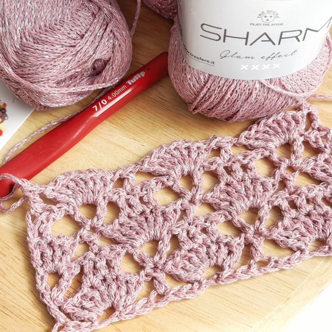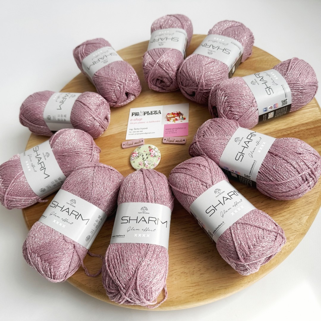 V balíčku jsme si rozbalili letošní novinku italského výrobce Tresfere s názvem SHARM. Sharm má 50g a návin 125m a jedná se o směs 75% bavlny a 25% polyesteru. Příze se bude hodit na outfit od jara do podzimu. Pro háčkování bude příze skvělá na bolérka, svetříky a kardigany s krajkovými nebo síťovými vzory. Sharm je spletená šňůrka, která obsahuje zlatou nebo stříbrnou nitku. Díky tomu oblečení dostane slavnostní ráz. Třpytivé svetříky a topíky jsou letošním hitem.