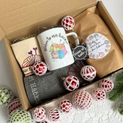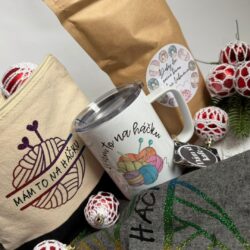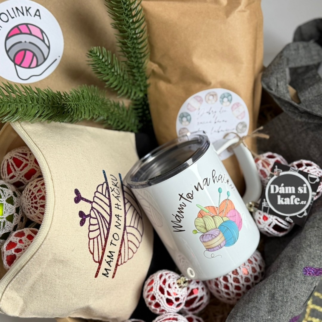 V dárkové krabici na nás čekala krásná taštička na háčky a označovače s nápisem “Mám to na háčku” a krásná velká plátěná taška na klubíčka se stejným motivem. Chcete tip pro Ježíška? Toto balení si můžete jednoduše poskládat také. Do dárkové krabice dej termohrnek s ouškem, přidej kávu nebo oříšky a jako bonus plátěnou tašku na klubka s motivem háčkování. Vše bude perfektně zabalené a připravené rovnou pod stromeček. Skvělý dárek pro sebe nebo pro kamarádku. Ježíškovi pošli tento odkaz, ať to nepoplete. Máš kamarádku pletařku? Na DámSiKafe.cz mají termohrnek i termosku s motivem pletení.