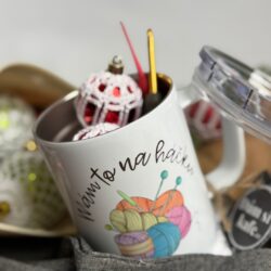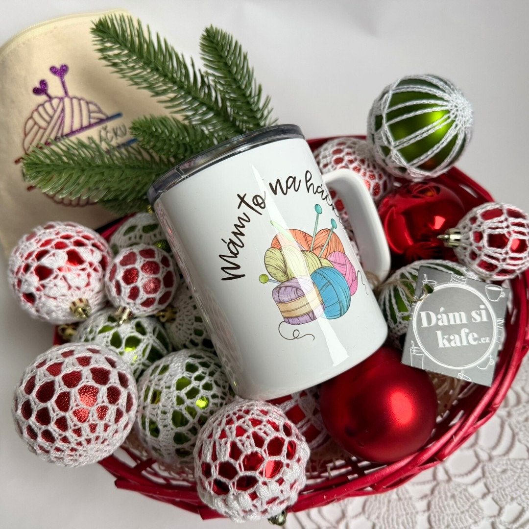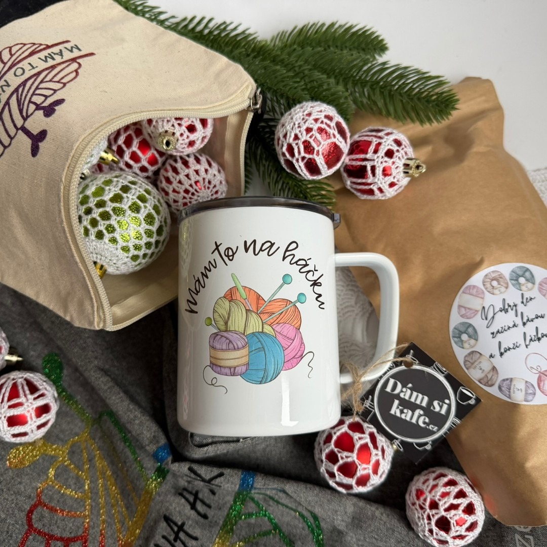 - Stylový termohrnek s háčko motivem — ideální parťák ke klubíčku doma i na cestách.