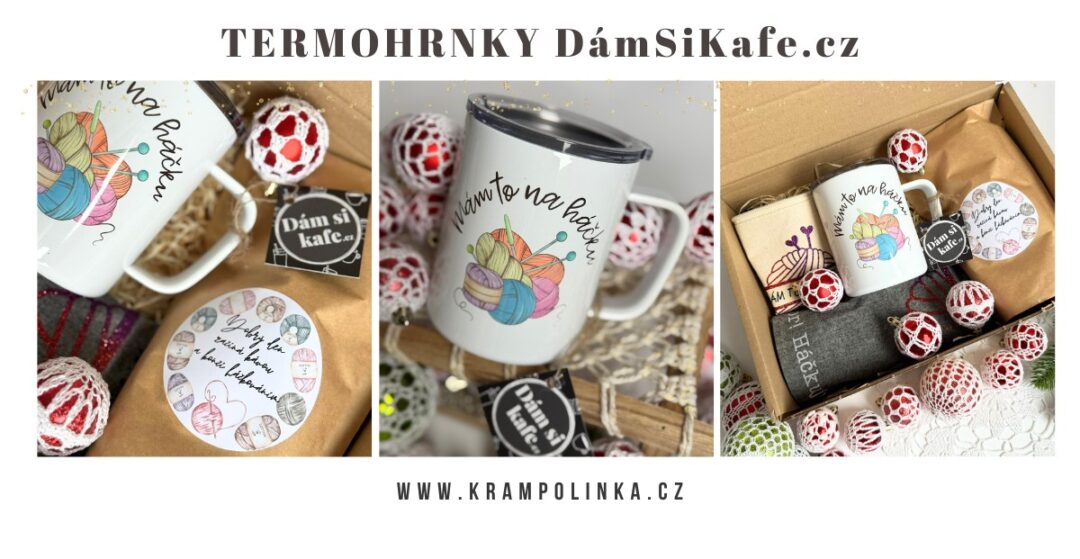 Rozbalili jsme si dárkovou krabici, kde byl stylový termohrnek s uchem s motivem háčkování “Mám to na háčku”. Parádní na pohled, ale hlavně dokonale praktický. Díky nerezové konstrukci udrží váš čaj nebo kávu 6 až 12 hodin teplé, a v létě zase udrží chladné osvěžení přesně tak dlouho, dokud vklidu nedodělám řadu. Na e-shopu si můžete koupit i termosku. Tyto hrnky jsou ideálním parťákem ke klubíčku – doma, na zahradě, v parku, na hřišti i na cestách. Můžete háčkovat, relaxovat a zároveň si vychutnávat svůj oblíbený nápoj stále teplý, případně studený.