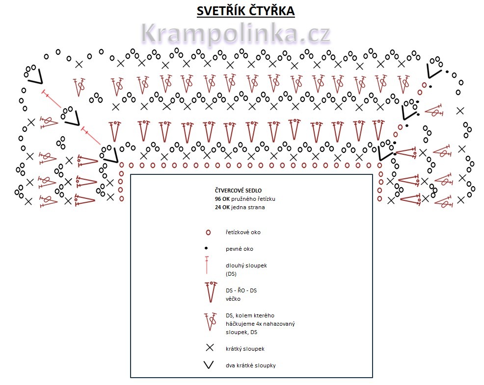 • Co se týče úpravy velikosti čtvercového sedla, háčkujeme více ok základního řetízku. Základní řetízek musí být dělitelný čtyřmi. Pro větší dětskou velikost stačí háčkovat více řad sedla. Při háčkování doporučuji přiměřovat ke svetříku nebo oblečení, případně zkoušet přímo na postavě. V návodu háčkujeme velikost 134-140, tj. 8-9 let. Pro menší velikost začínáme na 72 ok (jedna strana má 18 ok), na 80 ok (jedna strana má 20 ok) nebo na 88 ok (jedna strana má 22 ok). Pro dospělou velikost potřebujeme 120 ok (32 ok jedna strana) nebo 132 ok (jedna strana má 34 ok). Důležité je, aby se po spojení řetízku protáhla hlava. V podpaždí doporučuji použít 3 -5 ok, aby základ rukávu nebyl zbytečně široký. Při