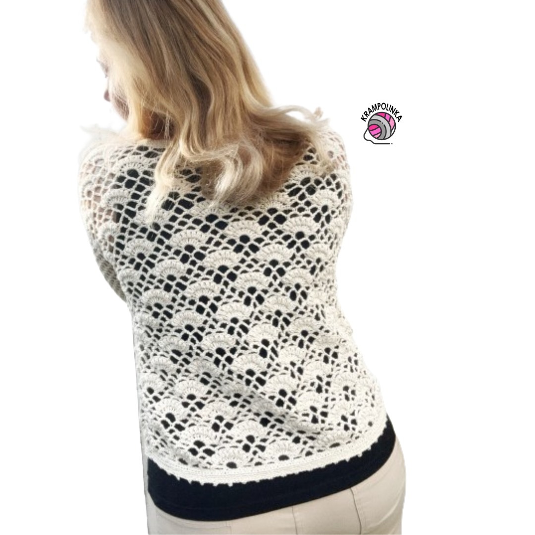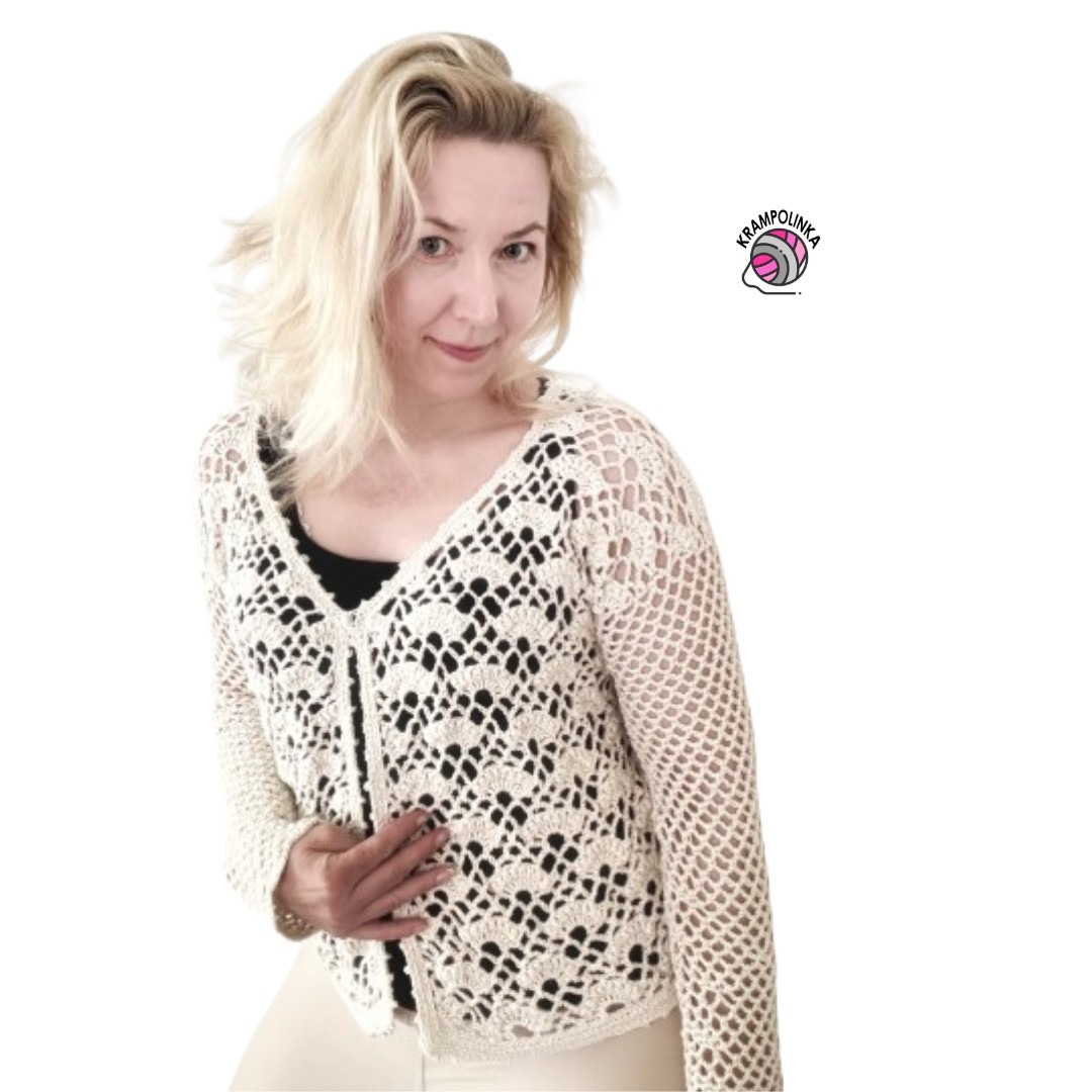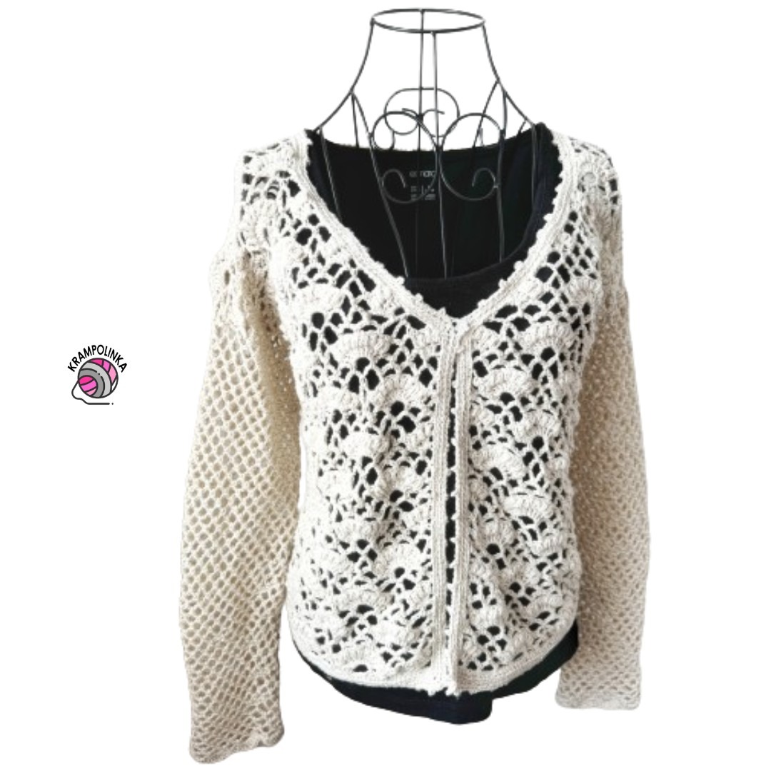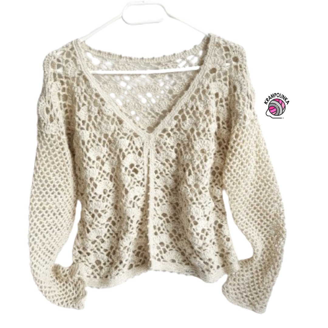• Co se týče svetříku, jedná se o jednoduchý střih. Háčkujeme rovný zádový díl a dva přední díly s tvarovaným průkrčníkem. Po sháčkování/sešití naháčkujeme síťové rukávy. Nakonec obháčkujeme. Zvolila jsem háček 3 mm a vzdušný krajkový vzor. Svetřík je navržený do pasu a bude se krásně nosit na letní šatičky, tílko nebo top.  Tento vzor krásně vynikne na přírodních barvách a světlých barevných tónech.