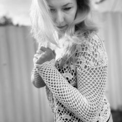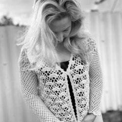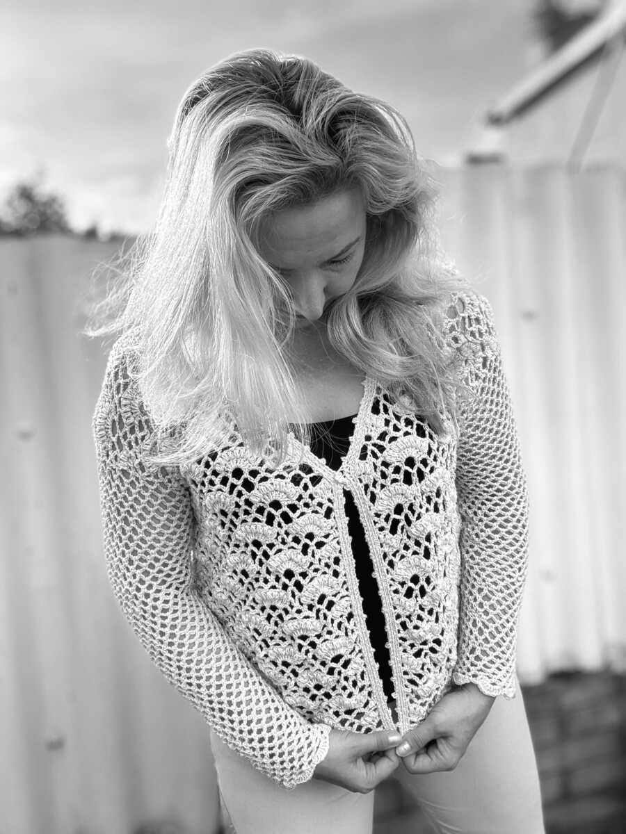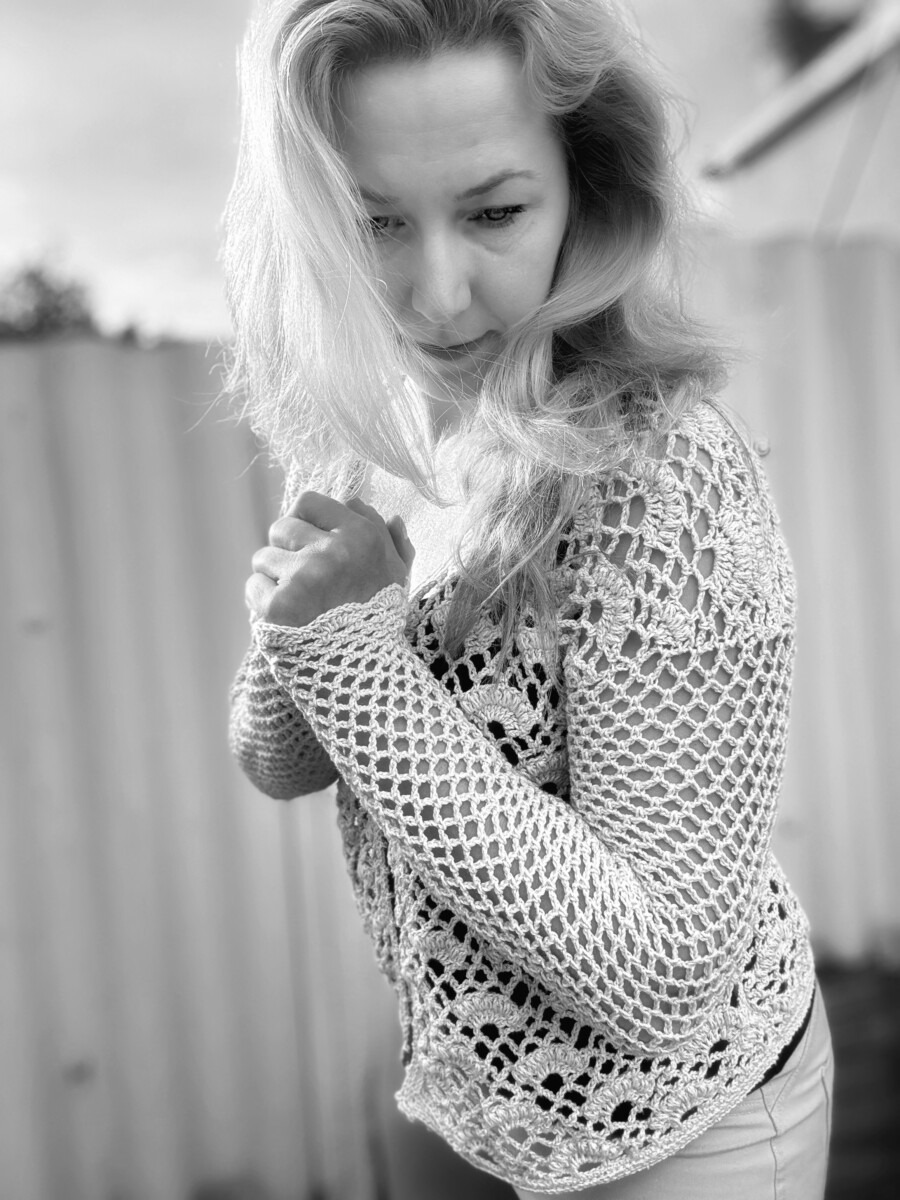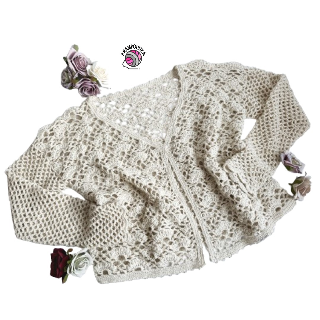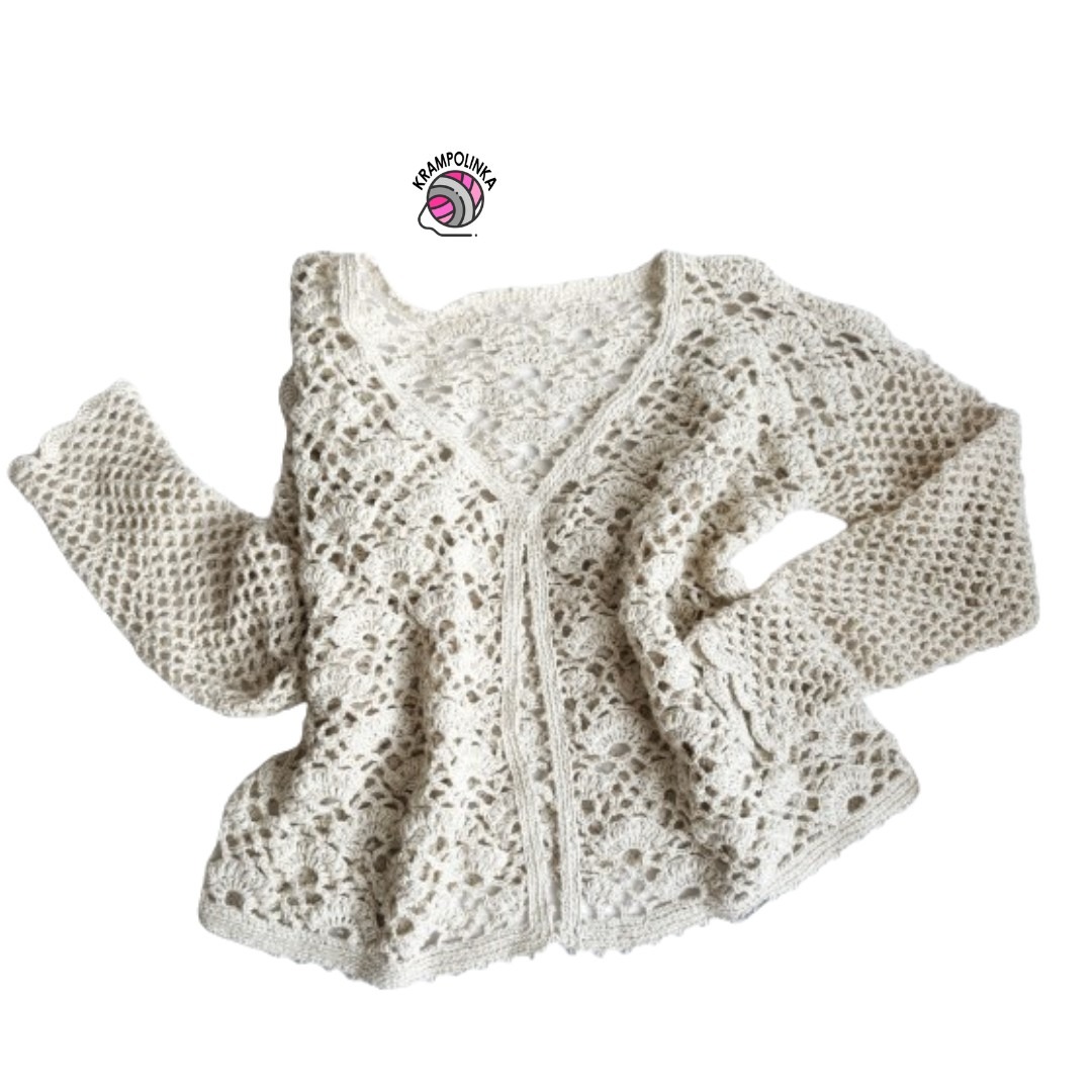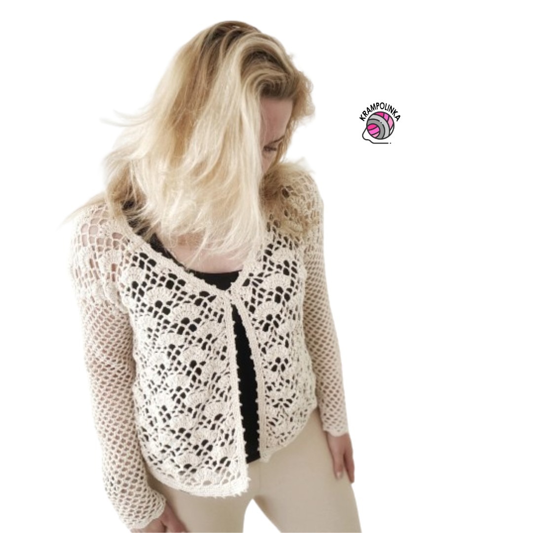 • Co se týče svetříku, jedná se o jednoduchý střih. Háčkujeme rovný zádový díl a dva přední díly s tvarovaným průkrčníkem. Po sháčkování/sešití naháčkujeme síťové rukávy. Nakonec obháčkujeme. Zvolila jsem háček 3 mm a vzdušný krajkový vzor. Svetřík je navržený do pasu a bude se krásně nosit na letní šatičky, tílko nebo top.  Tento vzor krásně vynikne na přírodních barvách a světlých barevných tónech.