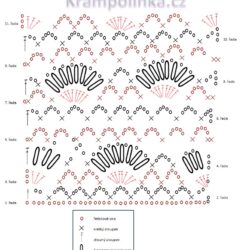 • Co se týče vzoru, působí krajkově a vzdušně. Háčkujeme řetízková oka, krátké sloupky a dlouhé sloupky. Věnujeme pozornost při ukončování řady. Opakuje se osm řad a díky tomu vzor vychází šachovnicově.