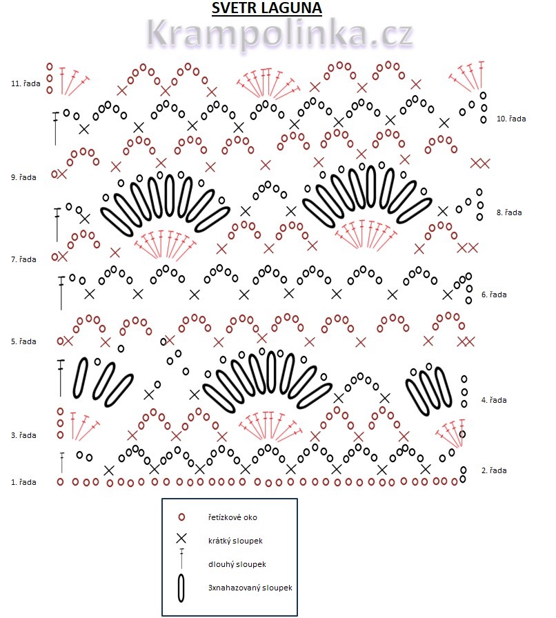 • Co se týče úpravy velikosti, můžete si uháčkovat jakoukoliv velikost. Stačí mít začátek ok dělitelný 16-ti + 4 oka. Dále stačí háčkovat více řad a můžete si velikost svetříku prodloužit nebo naopak zkrátit.