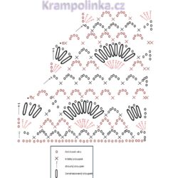 51. – 56. řada: háčkujeme stejně jako řady 7-14, ale musíme mít stejnou šířku jako průkrčník na zádovém díle, tj. máme dva krajní vzory a jeden celý vzor ve středu, přičemž vzor ve výstřihové části má 6 nikoliv 4 DS.
