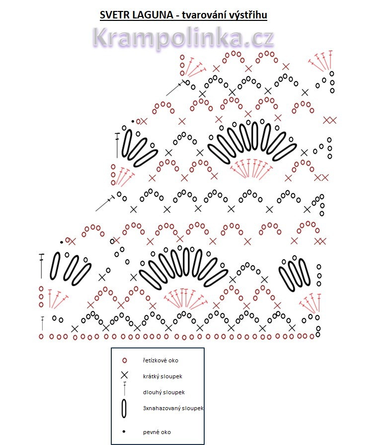 Přiměřujte a zkoušejte. Pokud by se Vám nedařil véčkový výstřih, stačí pokračovat rovně a vytvořit hranatý výstřih, stejně jako vybrání u průkrčníku na zadním díle, a dále obháčkovat do kulatého výstřihu.