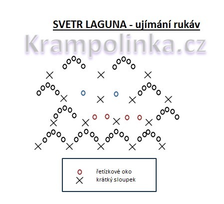 Pozn. Háčkujeme síťovým vzorem. Ujímáme 3 x v každé desáté řadě, 5 x v každé páté řadě. Počet řad rukávu uzpůsobíme vlastní délce paže.