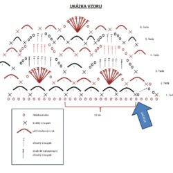 26. řada: háček vedeme do očka náhrady a uháčkujeme krátký sloupek. Do sousedního očka uháčkujeme polodlouhý sloupek. Pod ŘO uháčkujeme DS a do dalších sloupků háčkujeme po jednom DS. POZOR – pod ŘO háčkujeme DS. Dále DS do DS. Na konci řady háčkujeme DS pod ŘO. V krajovém vzoru háčkujeme DS do DS, DS do DS, DS pod ŘO, DS pod DS, DS pod DS a háčkujeme na druhé polovině dílu zrcadlově. V podpaždí háčkujeme DS do DS (neháčkujeme pod ŘO ve vzoru).