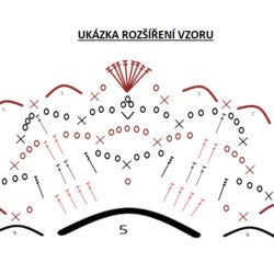 22. řada: V oblasti průramku na pravé a levé straně jsem háčkovala dle rozkresu rozšíření – viz nákres pod textem.