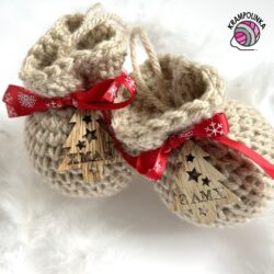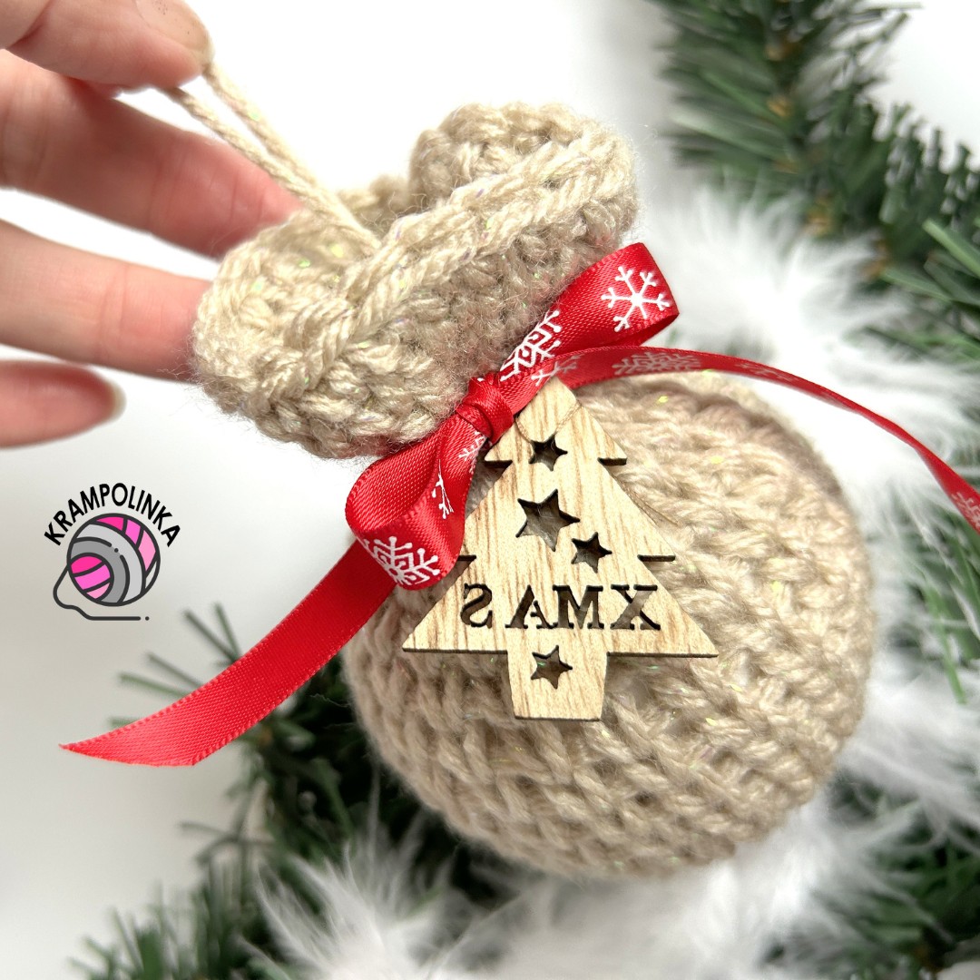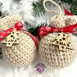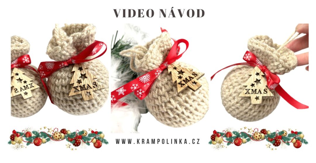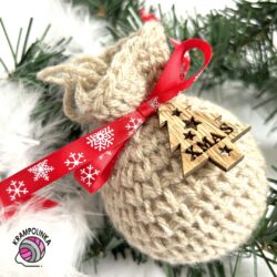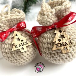 - Co se týče vánoční koule, jak se u nás říká “baňky”, budeme háčkovat jakoby tunel, do kterého baňku vložíme, spodní část sešijeme a horní část obvážeme mašličkou. Ozdoba bude vypadat jako vánoční koule v pytlíčku. Pokud před uvázáním do středu baňky vložíme poutko, můžeme i tuto vánoční ozdobu pověsit.